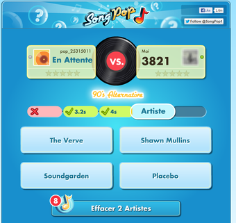 SongPop est un jeu social de blind-test dans lequel vous devez deviner le titre ou l’artiste des chansons qui passent. Vous pouvez choisir entre différentes listes (classic rock, rap, années 80) et défier des joueurs sur Facebook. Vous pouvez soit inviter vos amis à jouer avec vous, soit jouer avec des inconnus sélectionnés au hasard ou selon vos affinités musicales, comme dans Draw Something. Le jeu est gratuit mais vous pouvez acheter des bonus ou des listes de chansons supplémentaires.